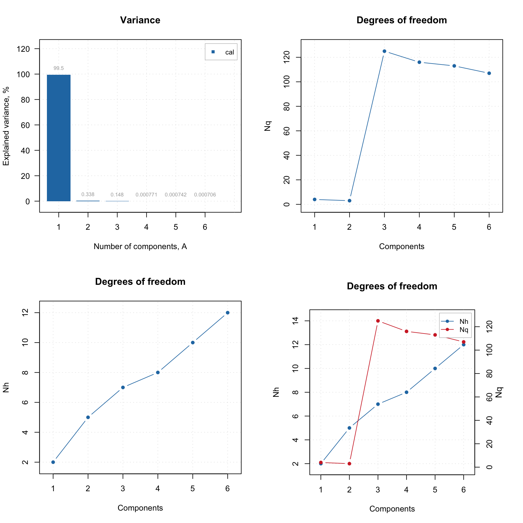 A simple plot, where the number of degrees of freedom is plotted against the number of components in PCA model can often reveal the presence of overfitting — the DoF value for the orthogonal distance, \(N_q\) jumps up significantly.