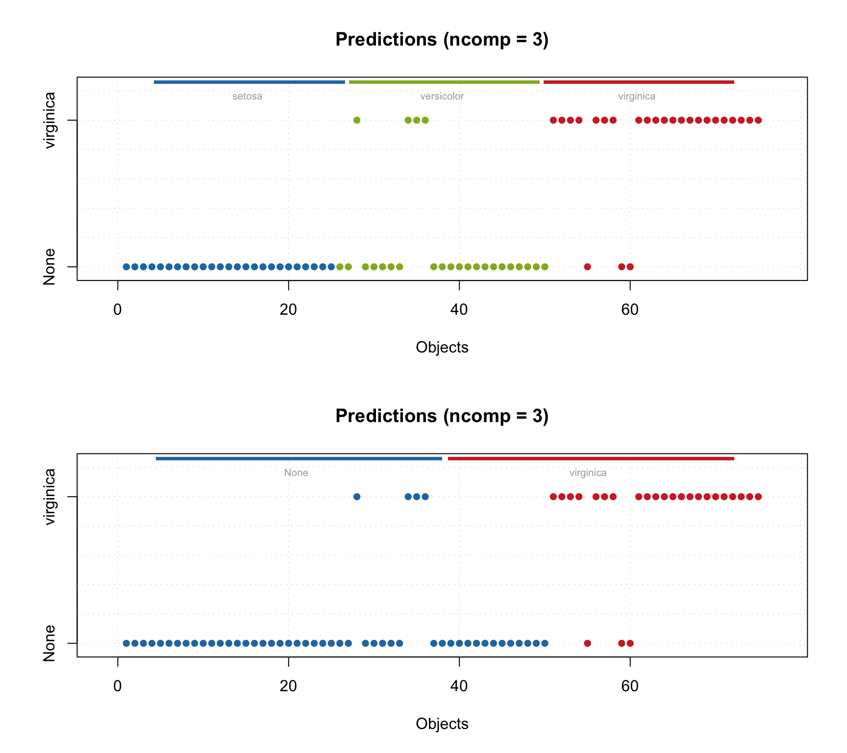 In case of one-class model, the reference values can be either factor/vector with names or logical values, like the ones used for calibration of the model. Here is an example for each of the cases.