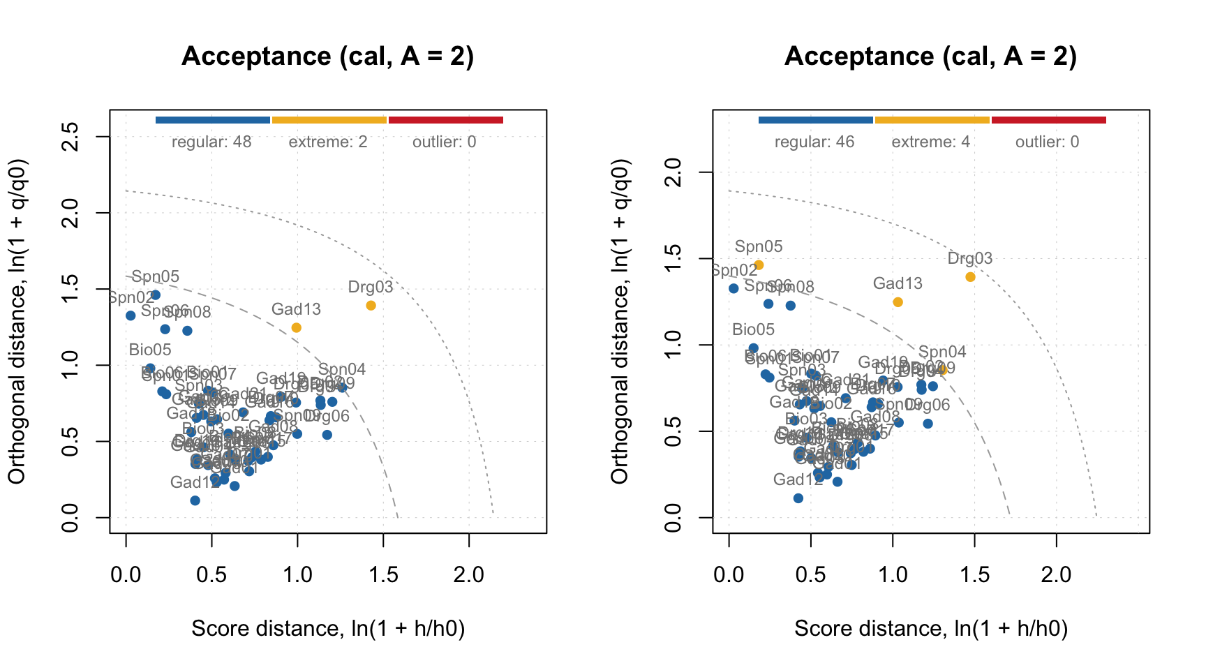 plotAcceptance(m, ncomp = 2, limType = "robust", show.labels = TRUE)