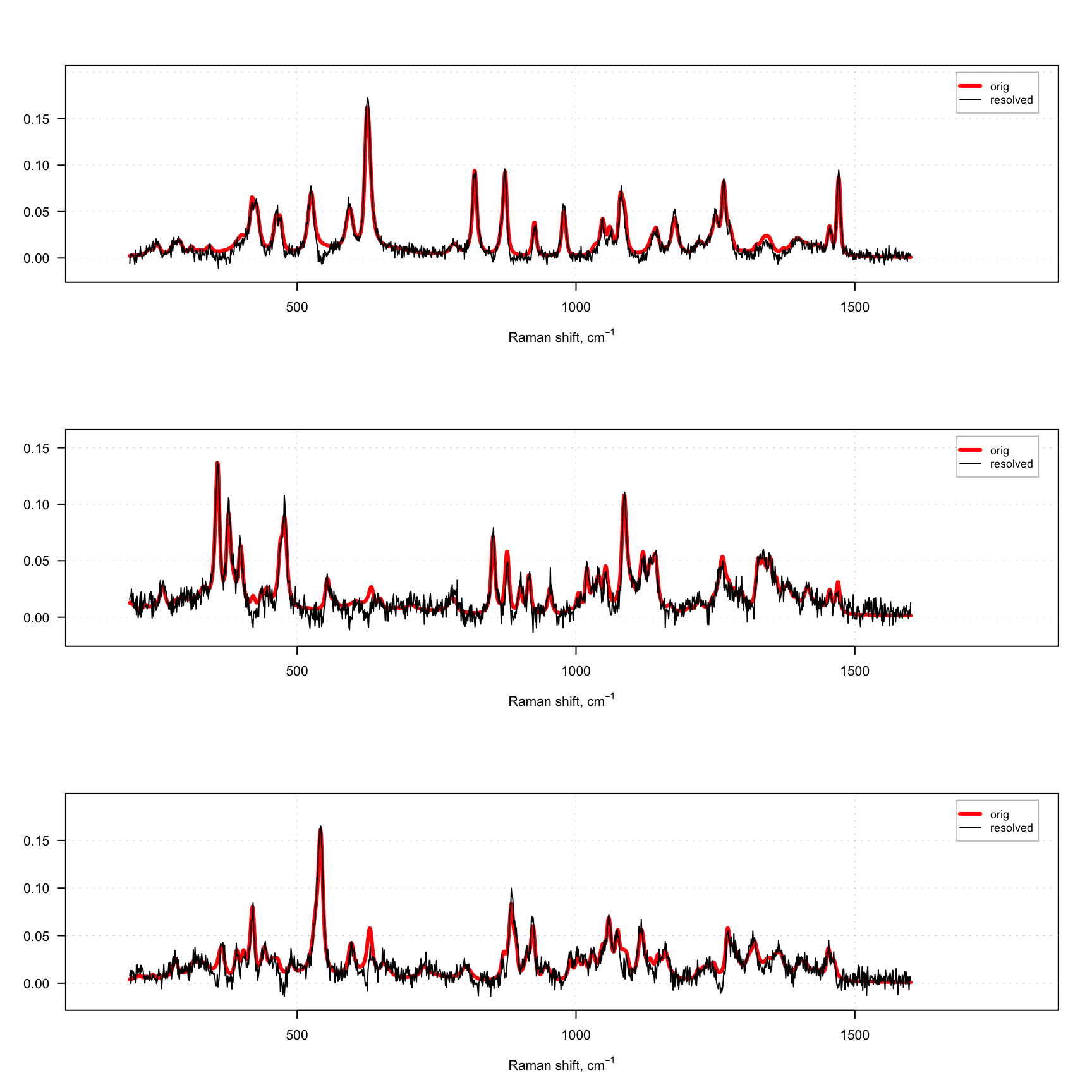 You may have noticed the following instruction: set.seed(6) in the code block above. This is needed to make results more reproducible. Since the initial estimates for the resolved spectra are obtained using random number generator, the final result can be different from run to run. To avoid this we seed the generator with number 6, so the final result will be the same regardless how many times we run this code.