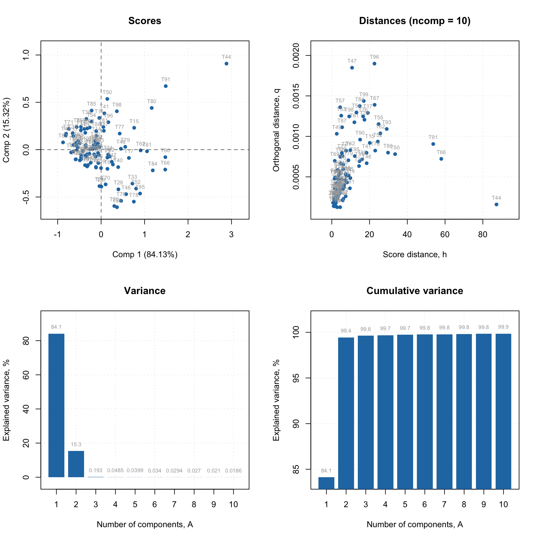 writeJSON(m, "pca-model.json")If you run the code on your computer you will see a new pca-model.json file created in the working directory. Now open https://mda.tools/pca in your browser, select tab Project and load the file with the model. You will see something similar to the following: