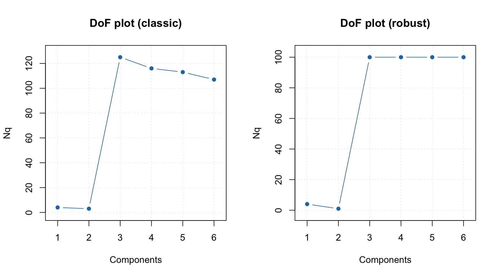 If outliers are present it can be useful to investigate the plot for \(N_q\) using classical and robust methods for estimation as shown in example below.