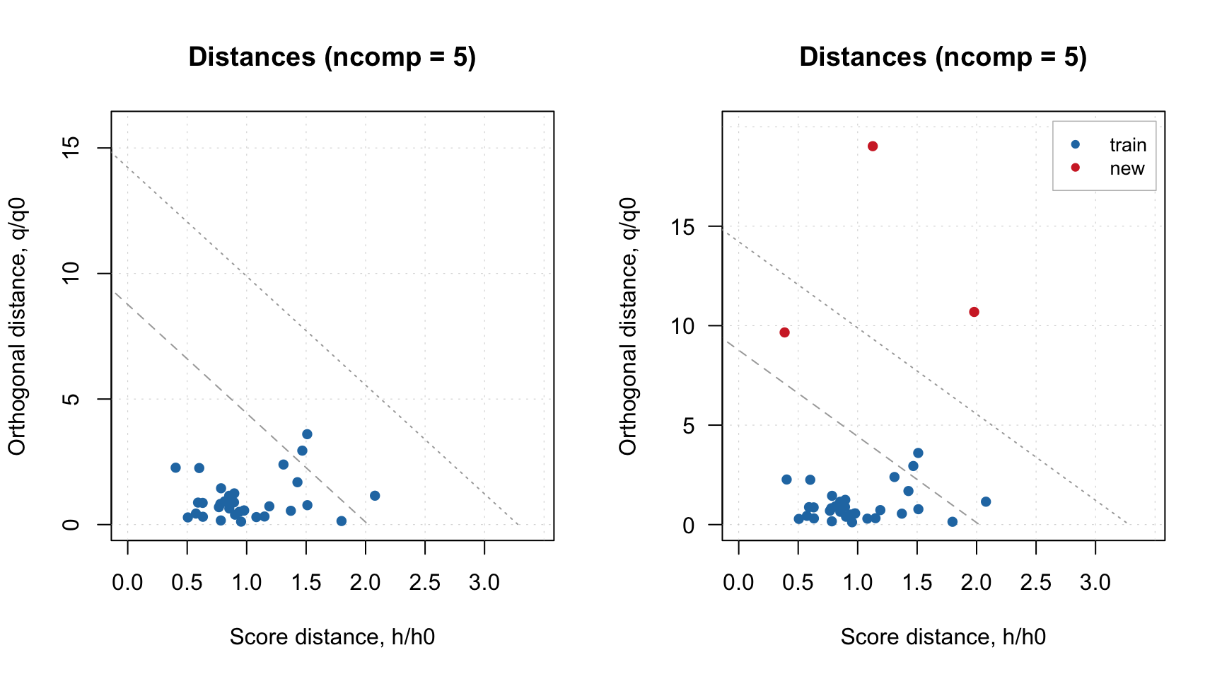 If model plot shows values from calibration and validation objects (e.g. scores, distances, etc), you can specify which result to show. In the example below left plot is made using default settings, for the right plot we specified a list with results explicitly (we show calibration results with label “train” and results for new measurements with label “new”). Note that the results should be specified as a named list (we also assume here that you ran code from the previous part of this section and have object res in your environment).