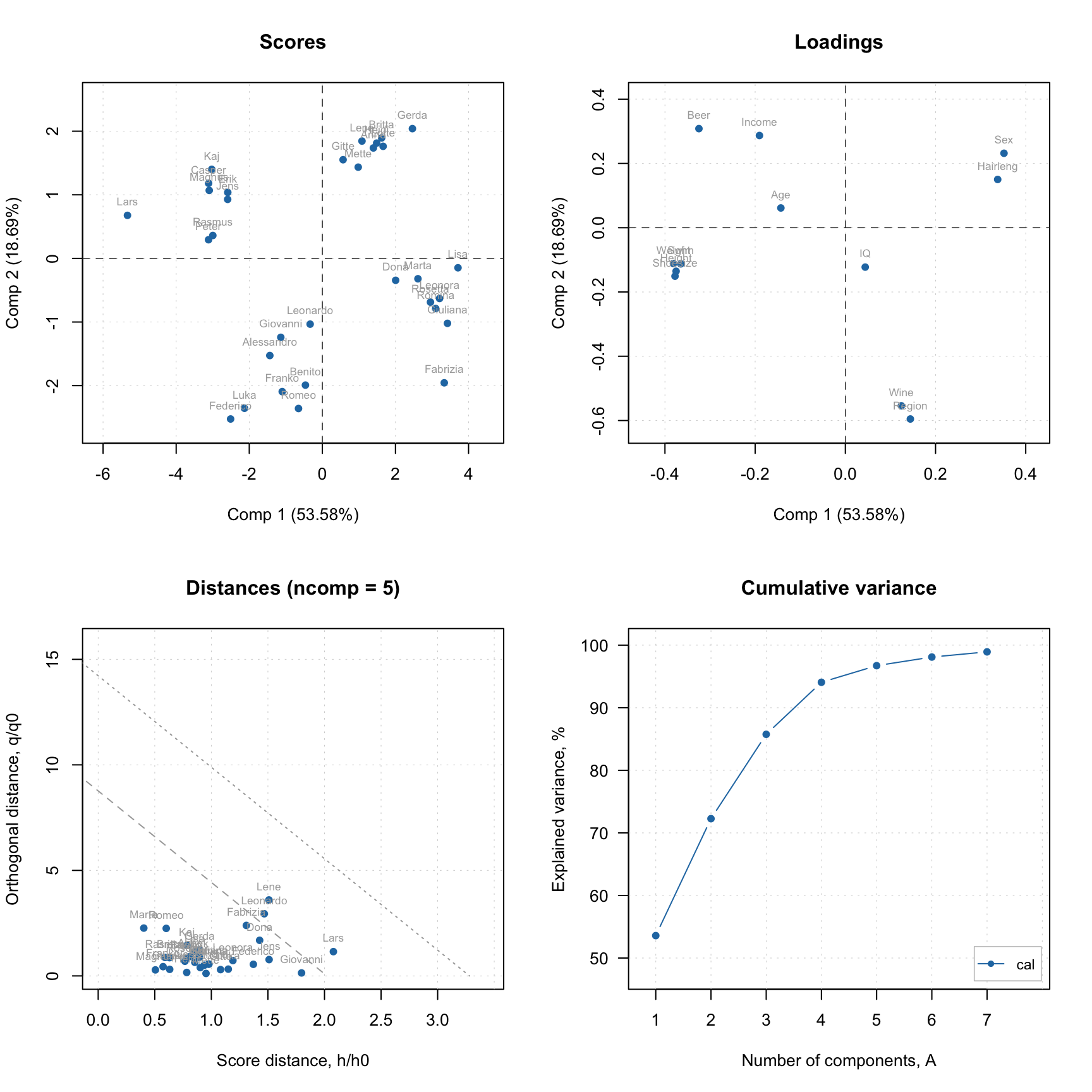 To simplify this routine, every model and result class also has a number of functions for visualization. Thus for PCA the function list includes scores and loadings plots, explained variance and cumulative explained variance plots, eigenvalues, distance plots, and many others.