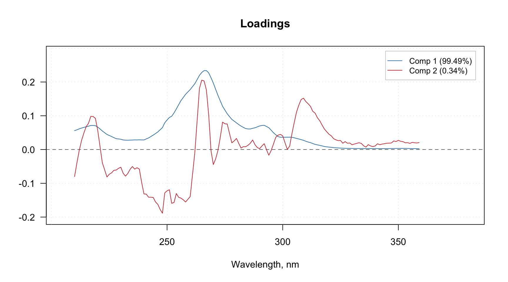 First of all, you can use the methods mdaplot() and mdaplotg() (or any others, e.g. ggplot2) for easy visualisation of the results as they are all available as matrices with proper names, attributes, etc. In the example below I create scores and loadings plots for PC1 vs PC2. Here I assume that the model from previous section is already created and available in your Global Environment. As you can see, I take the matrix with scores from the objects with calibration results (m$res$cal).