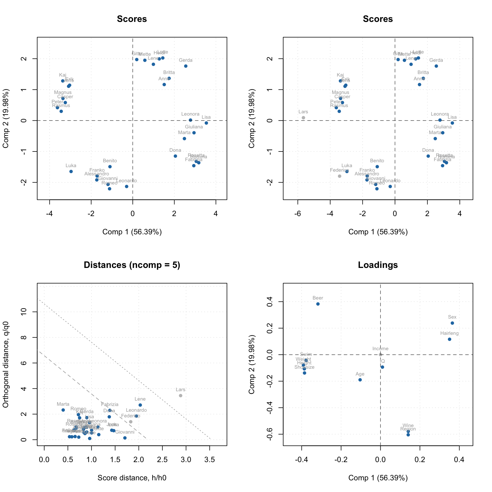 m = pca(people, 5, scale = TRUE, exclrows = c("Lars", "Federico"), exclcols = "Income")