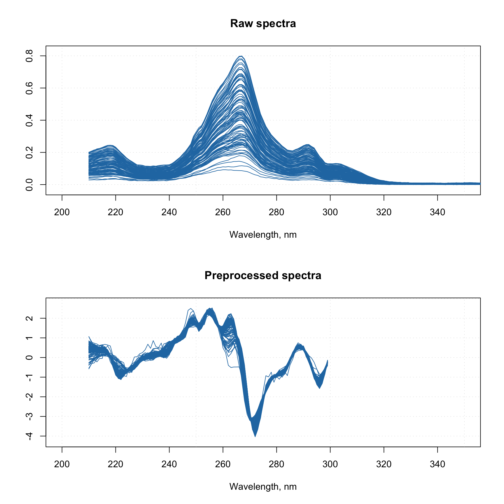 mdaplot(Xcp, type = "l", xlim = c(200, 350), main = "Preprocessed spectra")