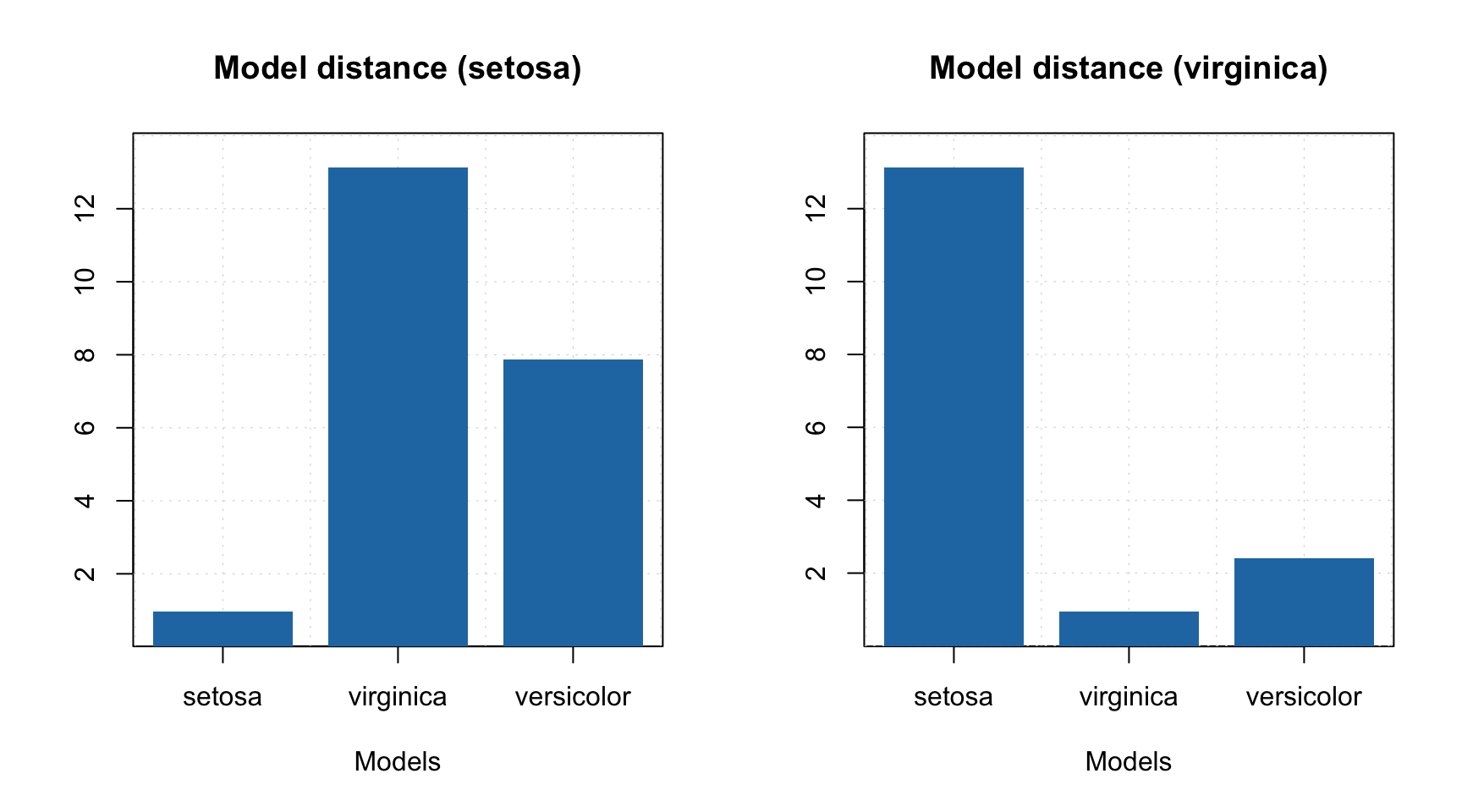 There are three additional plots available for multiclass SIMCA model. First of all it is a distance between a selected model and the others.